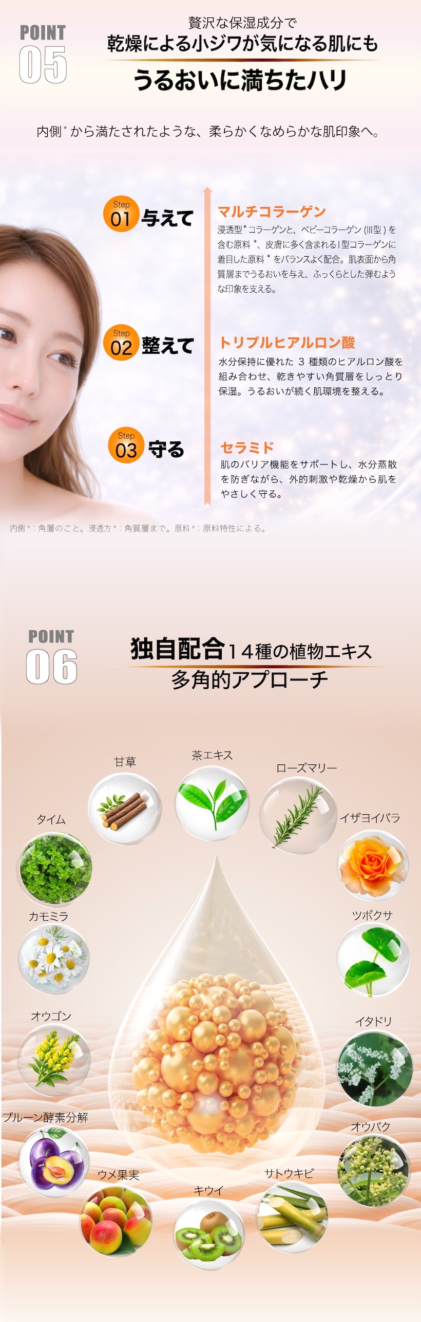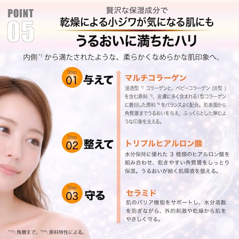 マルチコラーゲン(浸透型*、ベビーコラーゲン(Ⅲ型)を含む原料*、皮膚に多く含まれるⅠ型コラーゲンに着目した原料*)をバランス良く配合することで、ふっくらとしたハリ・弾力を支えます。