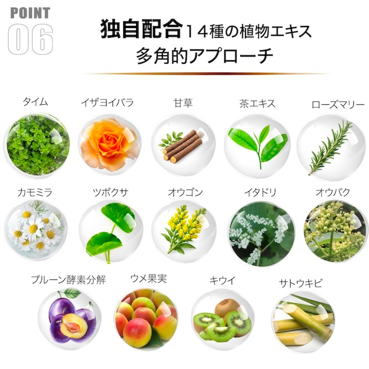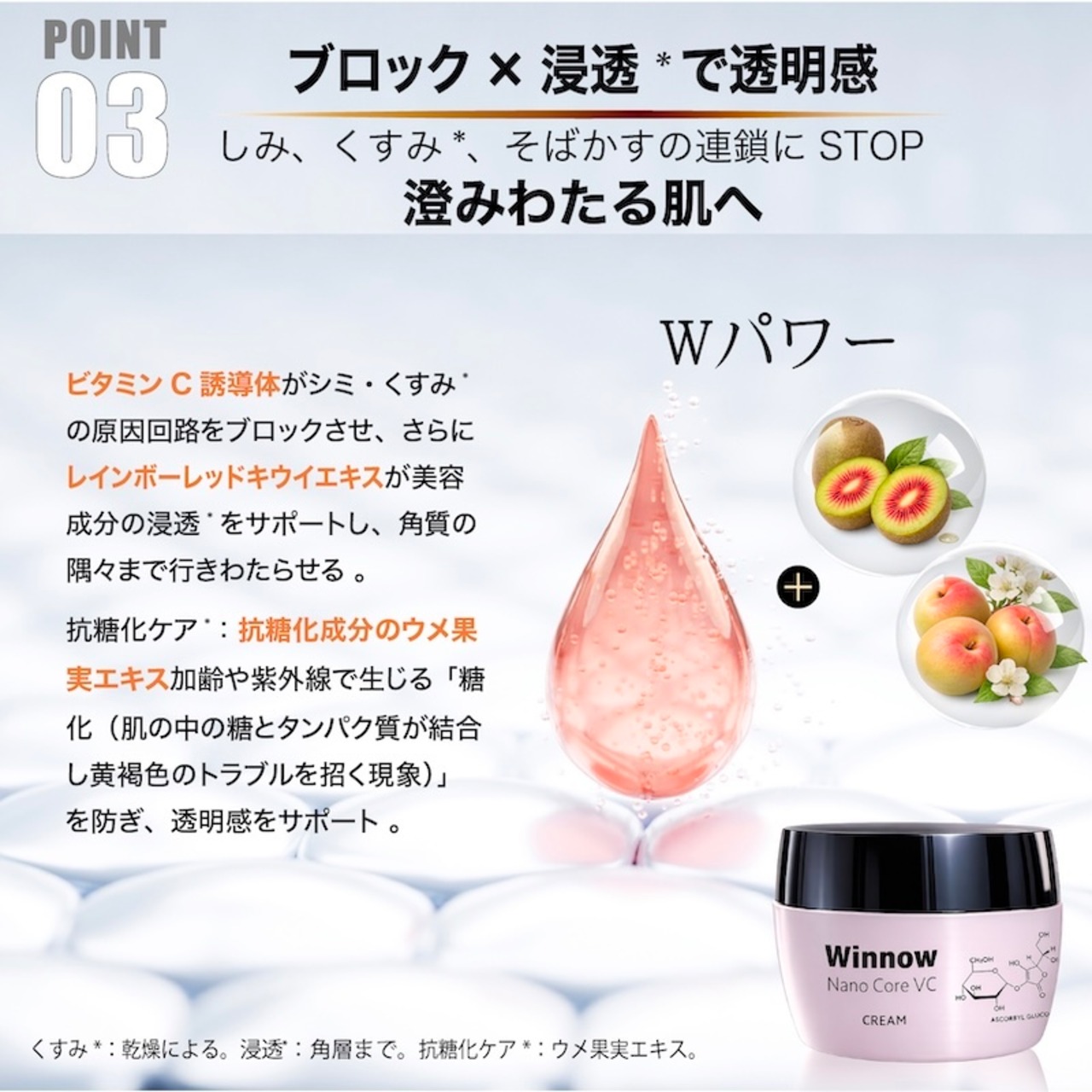 ビタミンC誘導体が原因回路をSTOPさせ、さらに、レインボーレッドキウイエキスが成分の通り道を広げて隅々まで行きわたらせます 。それに加え、ウメ果実エキスが、加齢や紫外線で生じる「糖化(肌の中の糖とタンパク質が結合し黄褐色のトラブルを招く現象)」を防ぎ、透明感をサポートします 。