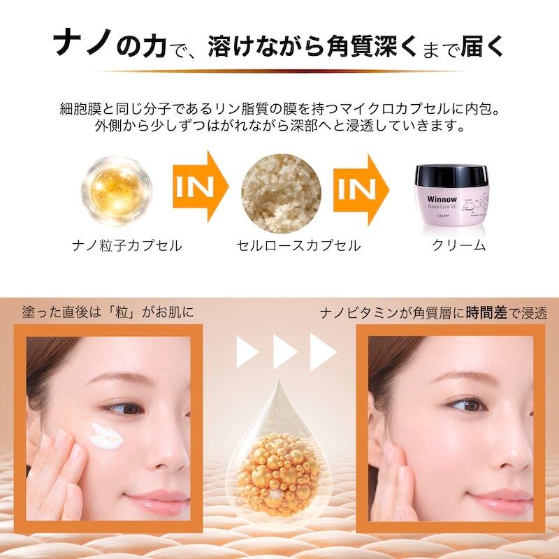 従来の乳化技術では粒子が大きく肌表面にとどまりがちでしたが、独自のナノ技術により6種類のビタミンを超微粒子化 。浸透の秘密:細胞膜と同じ分子(リン脂質)の膜を持つ100nm〜150nmのナノカプセルを採用 。時間差リリース:外側から少しずつはがれながら、角質層の奥深くまで美容成分をじっくり届け続けます 。