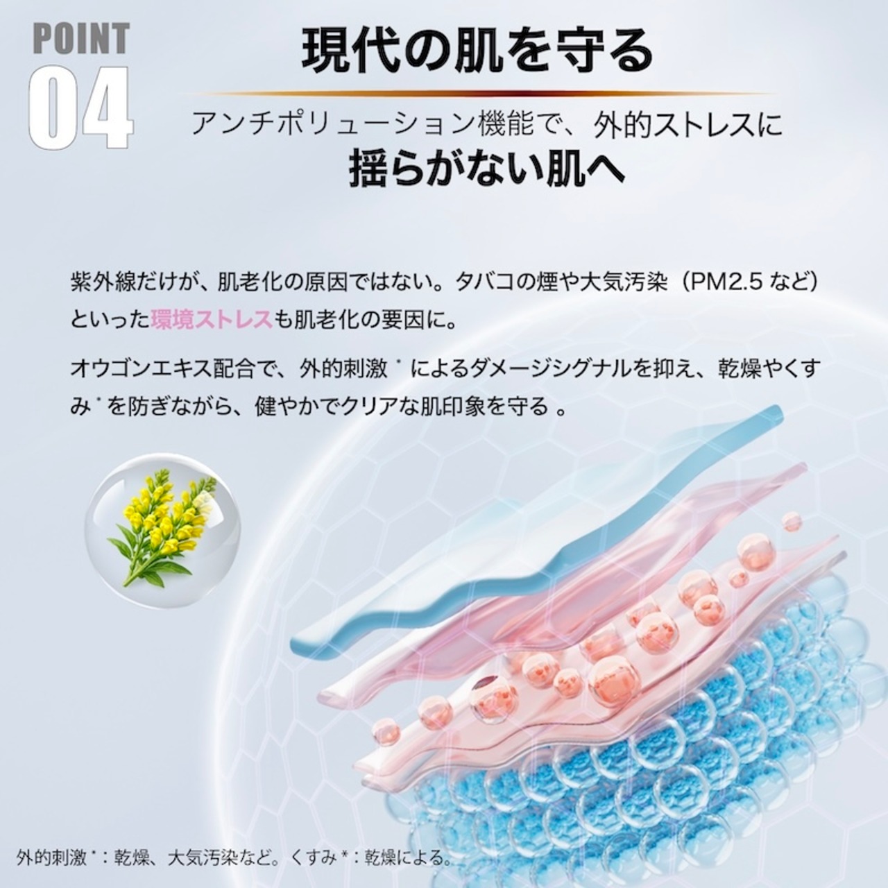 お肌の敵は紫外線だけではありません。タバコの煙や大気汚染(PM2.5など)といった環境ストレスも老化の原因となります 。オウゴンエキスを配合することで、環境ダメージからのシグナルを抑制し、肌の老化を防ぐ効果が期待できます 。