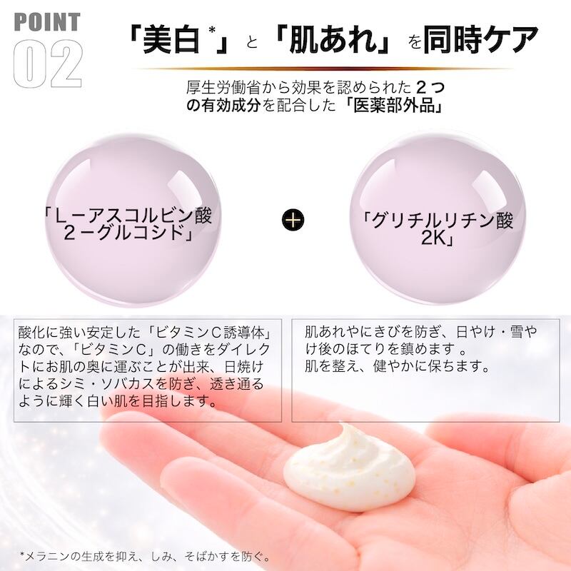本品は、2つの有効成分を配合した医薬部外品です。L-アスコルビン酸2-グルコシド(美白有効成分):酸化に強く安定したビタミンC誘導体で、メラニンの生成を抑え、シミ・そばかすを防ぎます 。グリチルリチン酸2K(抗炎症成分):肌あれやにきびを防ぎ、日やけ・雪やけ後のほてりを鎮めます 。