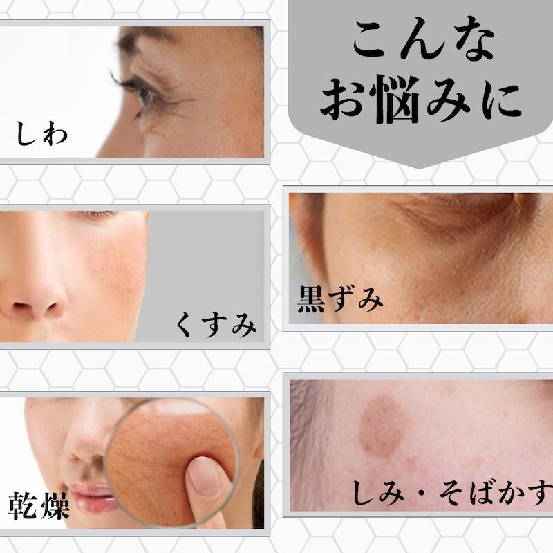 ご使用方法:スキンケアの最後にご利用ください。適量を取り、目元、口元、額、首などのしわ、シミ、そばかす、乾燥が気になる部位に優しくなじませます。