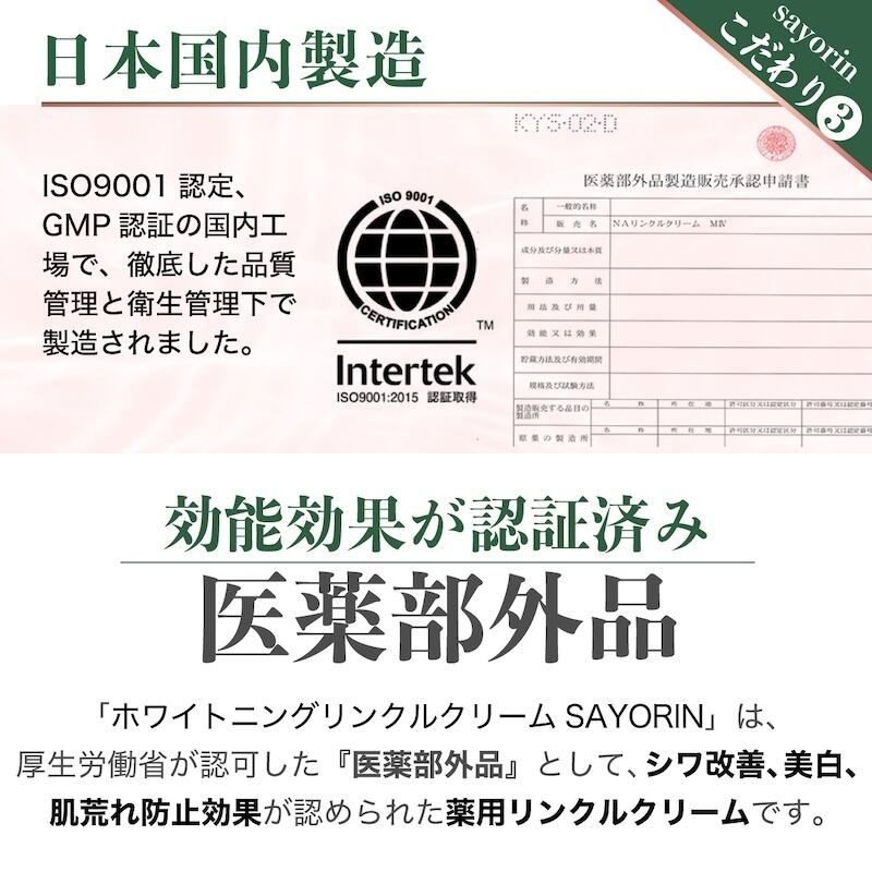 ■効果・効能:抗しわ(シワを改善、しわを予防);美白(メラニンの生成をおさえ、しみ、そばかすを防ぐ);肌荒れ防止(肌に潤い与え、引き締め、整える、肌荒れ予防する)。