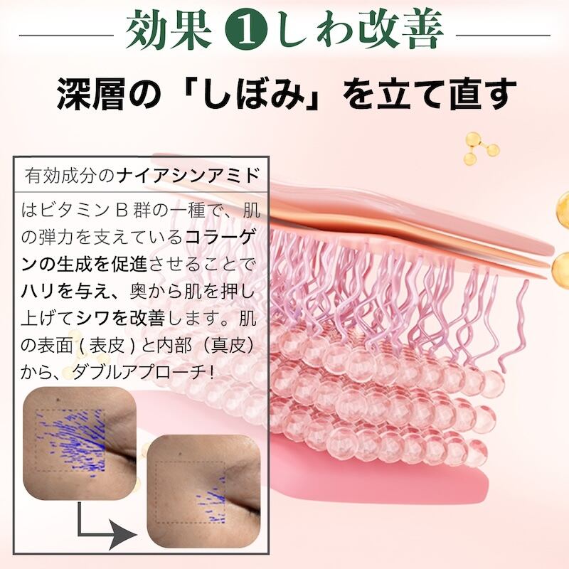 ・シワ改善レシピ:有効成分のナイアシンアミド+ナス果実エキス融合。肌の弾力を支えているコラーゲンの生成を促進させ、奥からお肌を押し上げてシワを改善。ナス果実エキスは、真皮線維芽細胞においてもコラーゲンの生産を促す効果があり、真皮構造を強固にし、皮膚弾力を維持する。