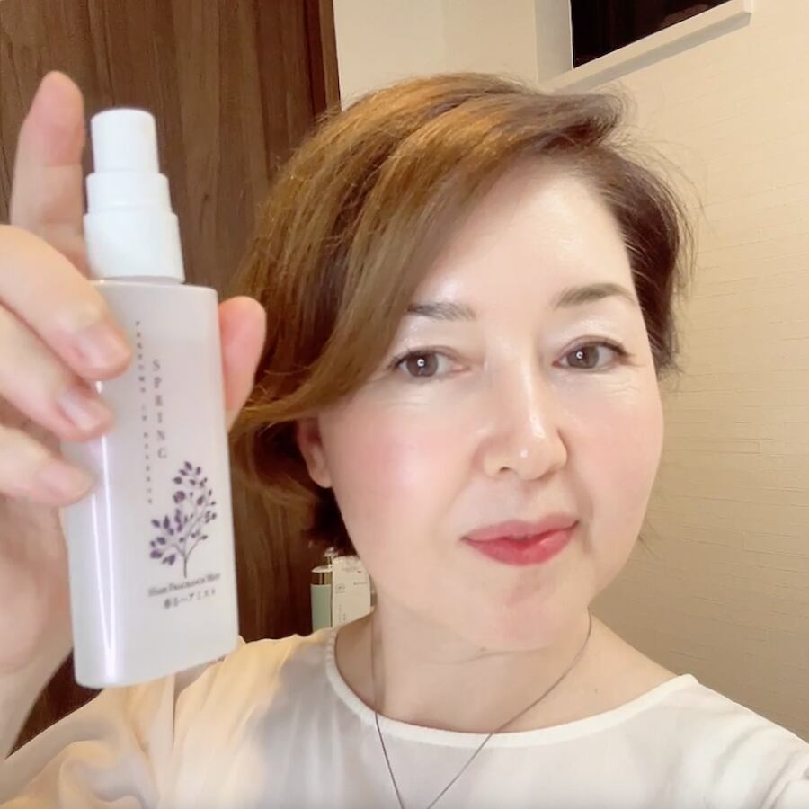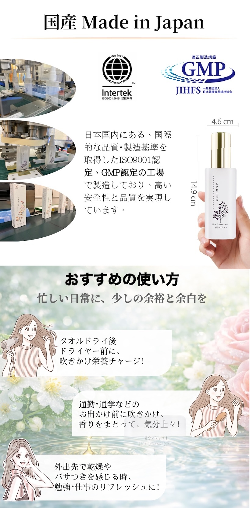 髪の乾燥が気になる時、リフレッシュしたい時に、髪から10~20cmほど離して、2~3回スプレーして使います。さらりとしたテクスチャーで、気になる時に何度お使いいただいてもべたつきません。