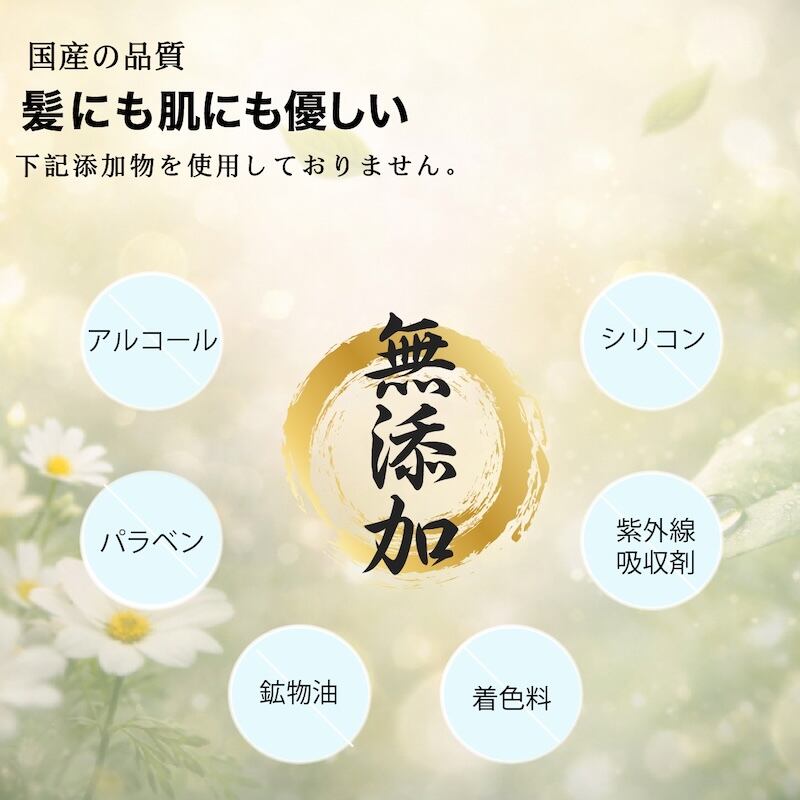 ■ 6つの無添加。パラベンフリー、アルコールフリー、鉱物油フリー、着色料無添加、シリコン無添加、紫外線吸収剤不使用。髪と頭皮にやさしい配合となっています。