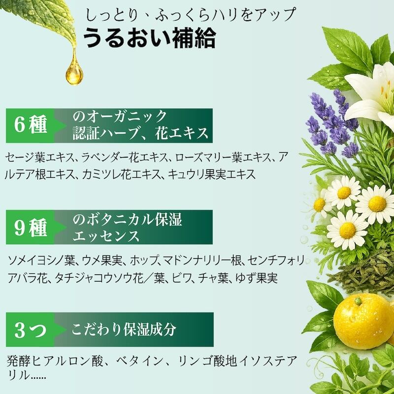 【全成分】水,プロパンジオール、PPG-6デシルテトラデセス-30、ベタイン、メチルグルセス-10、シクロヘキサン−1,4−ジカルボン酸ビスエトキシジグリコール、クレアチン、ココイルアルギニンエチルPCA、ベルガモット果実油、リンゴ酸ジイソステアリル、BG、DPG、PCA-Na、ジラウロイルグルタミン酸リシンNa、ゼイン、ソメイヨシノ葉エキス、ウメ果実エキス、ホップエキス、マドンナリリー根エキス、セージ葉エキス、タチジャコウソウ花/葉エキス、ラベンダー花エキス、ローズマリー葉エキス、アルテア根エキス、カミツレ花エキス、センチフォリアバラ花エキス、ヒアルロン酸ヒドロキシプロピルトリモニウム、ビワ葉エキス、キュウリ果実エキス、チャ葉エキス、ユズ果実エキス、クエン酸、クエン酸Na、フェノキシエタノール、香料。