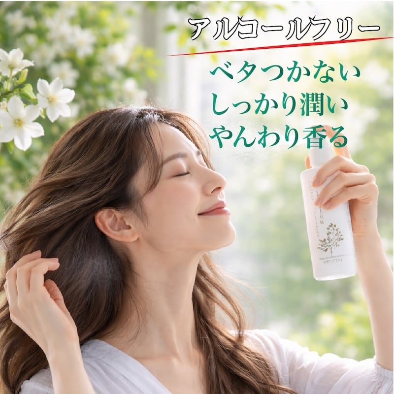 髪用の香る美容液。植物由来のさまざまなエッセンスが、髪に潤いを与え、みずみずしい印象へと導きます。爽やかで甘さが溶け合うジャスミン系の香りが広がります!